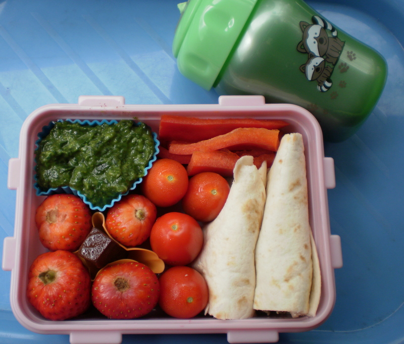 Esparregado que serviu de dip a tiras de pimento vermelho, tomates cherry, morangos biológicos, chocolate preto Dr. Atkins, wrap com peito de frango grelhado e queijo creme light.